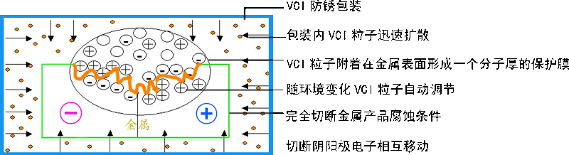 VCI是英文(Volatile Corrosion Inhibitor)的縮寫(xiě),它是一種具有揮發(fā)性的腐蝕抑制劑,簡(jiǎn)稱為氣化性防銹產(chǎn)品。當(dāng)用氣化性防銹產(chǎn)品包裝好被包裝物以后,防銹產(chǎn)品的防銹粒子氣化成氣體,吸附在金屬表面形成保護(hù)膜,切斷金屬離子與水、氧氣接觸的可能性,有效抑制了金屬腐蝕電化學(xué)反應(yīng)的發(fā)生,從而達(dá)到防銹效果。包裝后內(nèi)部的防銹粒子的氣化擴(kuò)散量自動(dòng)調(diào)節(jié),當(dāng)濕度或溫度增大時(shí),防銹粒子的擴(kuò)散量也會(huì)加大, 反之,防銹粒子的擴(kuò)散量會(huì)減小,從而來(lái)自動(dòng)調(diào)節(jié)包裝物內(nèi)部的氣體濃度,讓包裝物始終處于一種最穩(wěn)定的防銹狀態(tài)。 ![]()