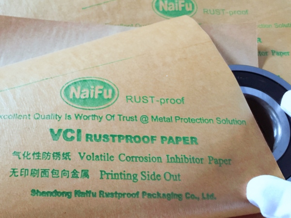 4、包裝過程---將含有緩蝕劑的面朝向金屬包裝,不覆膜防銹紙可作為金屬產(chǎn)品間墊層隔材使用,以免其他材質(zhì)阻隔材料含S、CL化學(xué)成分,影響防銹效果